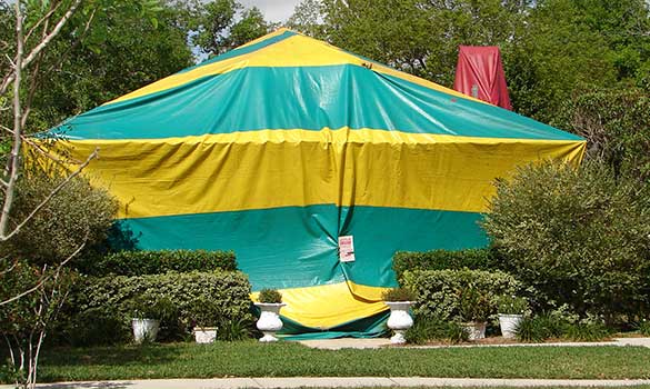 Structural fumigation is a pest control method that involves filling the airspace within a structure with a fumigant. A tarp, or tent, is used over the structure to trap the fumigant inside. The fumigant absorbs into cracks, crevices, and pores in the wood to eliminate pests, such as drywood termites, bed bugs, wood borers, and powderpost beetles. This is also the most effective way to treat for drywood termites once they have infested a structure.